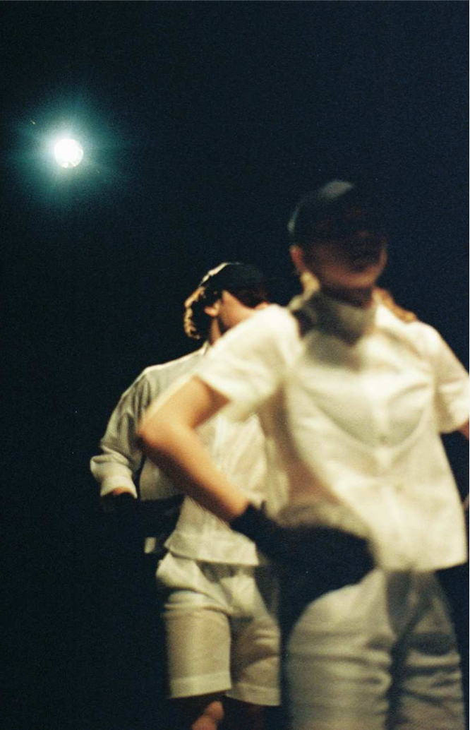 Em cima dos quatro pés, que tomam conta do palco à medida que se conquista um espaço deixado vago. Em todo o seu peso, assumem a contradição diante das sugestões da música, cujas notas rodopiam: atitudes de bad boy, as costas curvadas, as coxas afastadas... Os corpos não se deixam enganar. No entanto, falta pouco para que